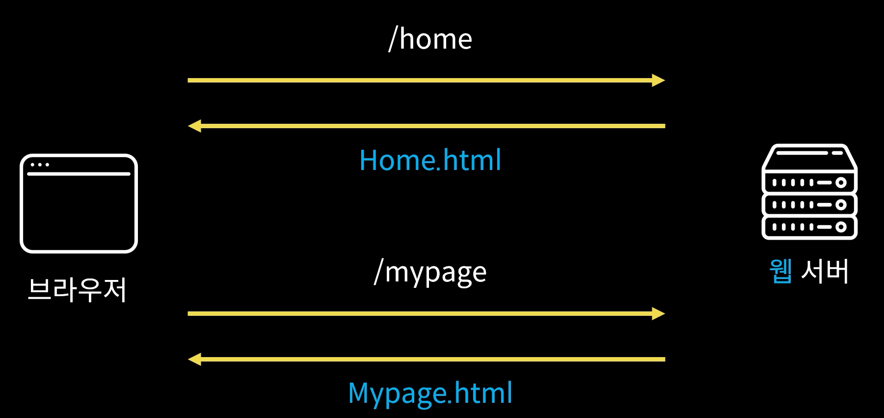 이처럼, 여러개의 페이지를 준비해 놨다가 요청이들어오면 경우에 따라 적절한 페이지를 보여주는 방식을 MPA(Multipage Application) 방식 이라고 한다.