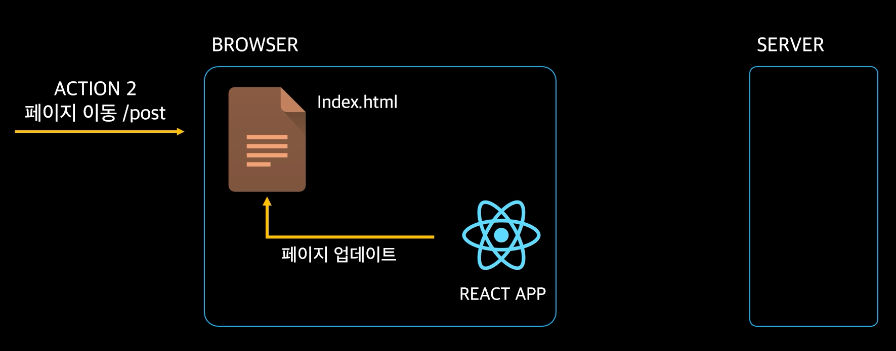 페이지를 이동할 때 서버에게 페이지를 요청하여 응답 받는 것이 아니라, 브라우저에서 REACT APP 이 페이지를 알아서 업데이트 시켜준다. 페이지를 이동할 때 마다 서버와 통신하여 기다리는 시간 자체가 없어지기 때문에 Page 전환 자체가 굉장이 빨라진다.