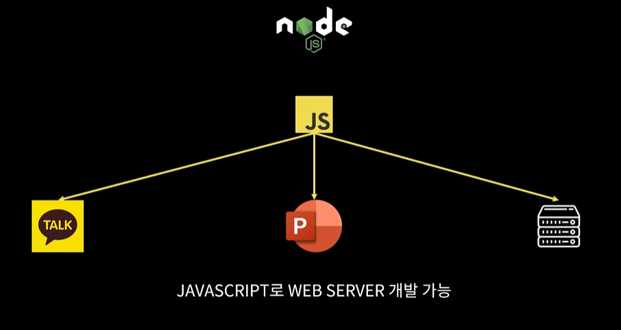 javascript 가 Node.js 를 이용해서 브라우저 외부 에서 독립적으로 사용할 수 있기 때문에 카카오톡이나 ppt 와 같은 pc 프로그램을 만들 수 있을 뿐만 아니라 Web Sserver 도 만들 수 있다.