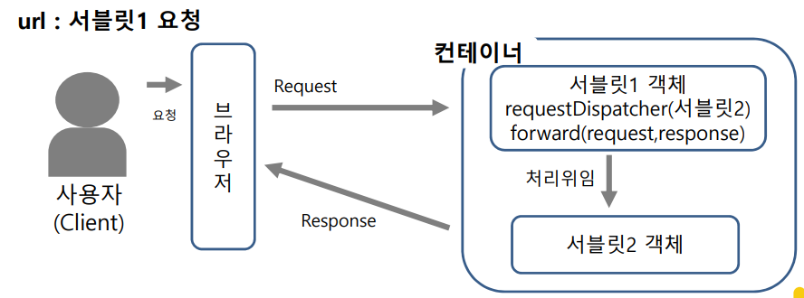 * requestDispatcher() ~ forward() : 컨터이너 내에서 처음 요청 받은 페이지가 요청 데이터를(HttpServletRequest, HttpServletResponse)를 다른 페이지에 전송하여 처리를 요청을 하고 자신이 처리한 것 처럼 하는 것.